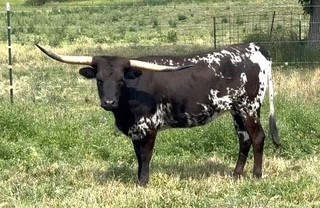 Beautiful black and white mottled heifer from the legendary Sam Chex 708. He was the 2017, 2018, 2019 and 2020 HSC tip tip Champion. He was also the 2018 Bull Alley Champion. Who's dam was none other than BL Sadie, which was sired by Farlap Chex. The topside is second to none. RLL SCR's bottom side is just as impressive. Hailing from the Dauntless Longhorns program in New Braunfels, TX; her dam is Dauntless Coal Run who currently resides in my pasture. Her grand dam is Dauntless Biscuit Runner, an over 90" ttt hammer of a cow. Dauntless Coal Run's sire is Dauntless Coal Train which brings in names like WBAR Fireproof, PCC Rimrock, JP Rio Grande, Farlap Chex, BL Farlap Safari, and VJ Tommie. If you are looking for something that will bring in color AND pedigree, RLL Sam's Coal Run is the one for you.