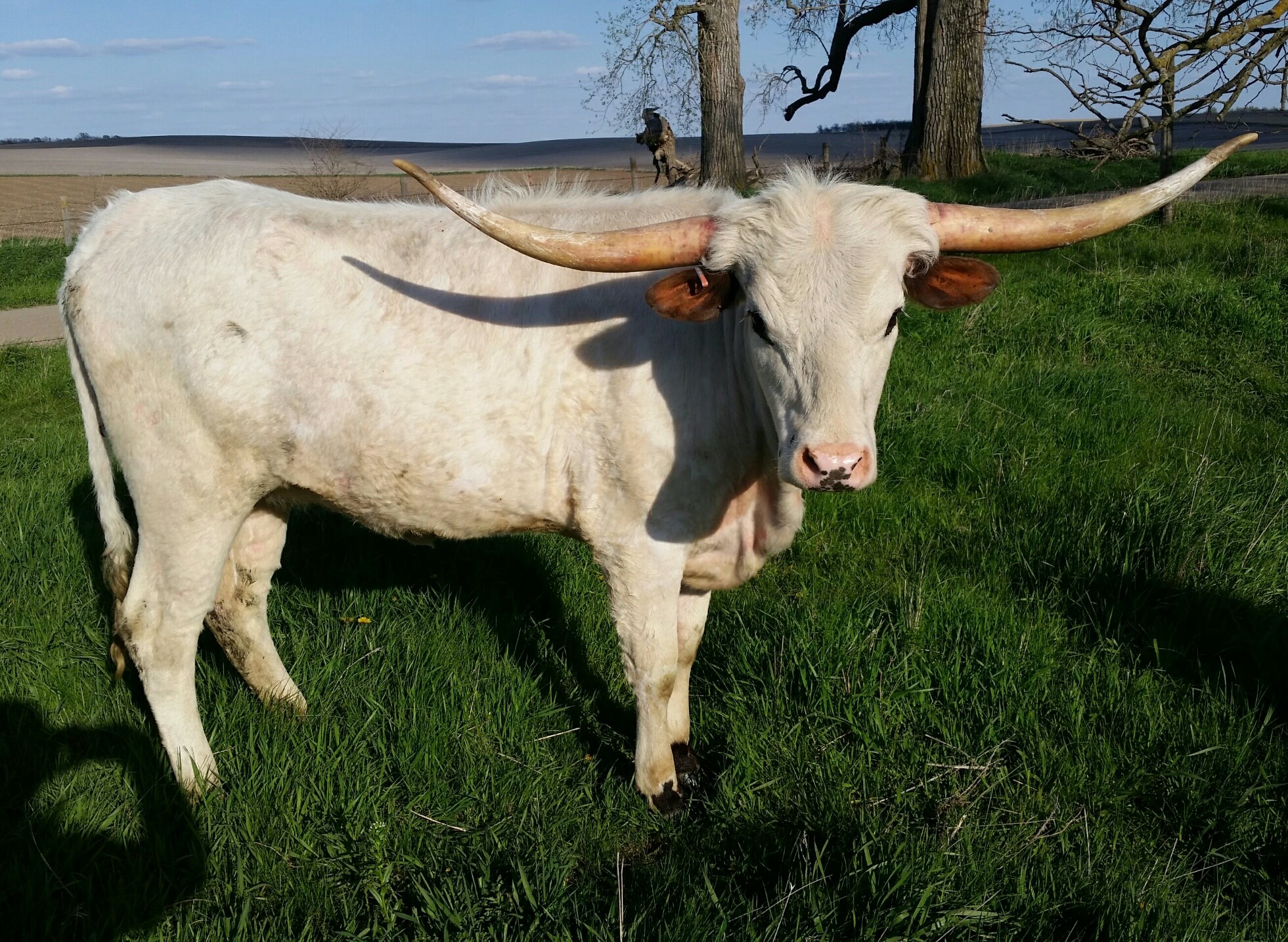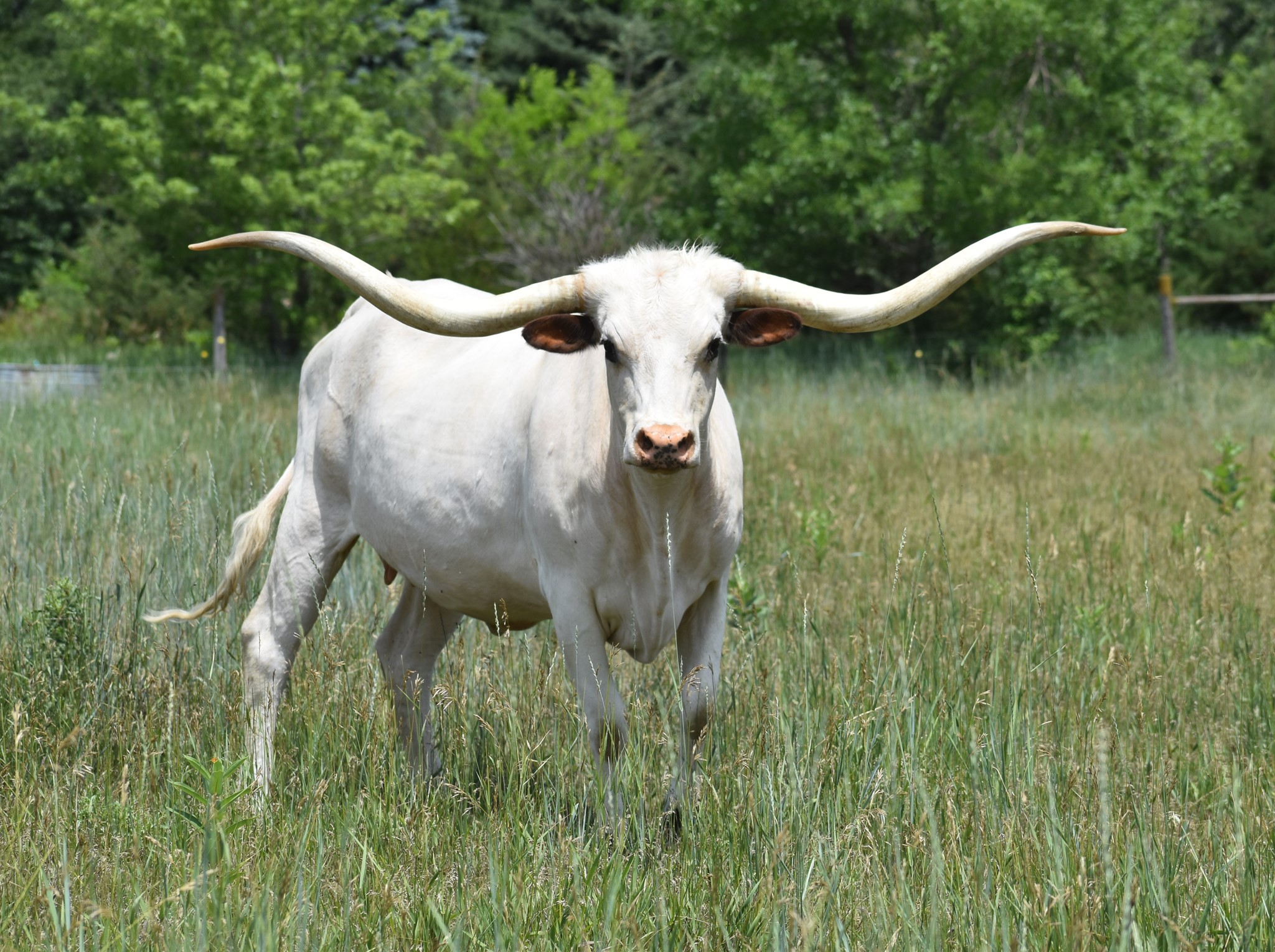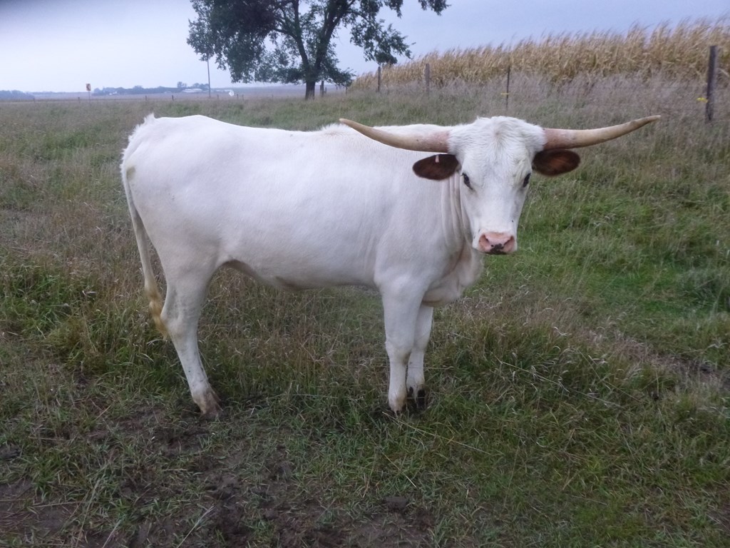 This gal has tons of lateral horn with a great twist. She is 84.5'' TTT and by the wow cow, Carmen BCB 123 who has over 118" of total horn. Maybellene is tall, feminine and very gentle. She has a gorgeous 2024 heifer by Drag Iron at side.