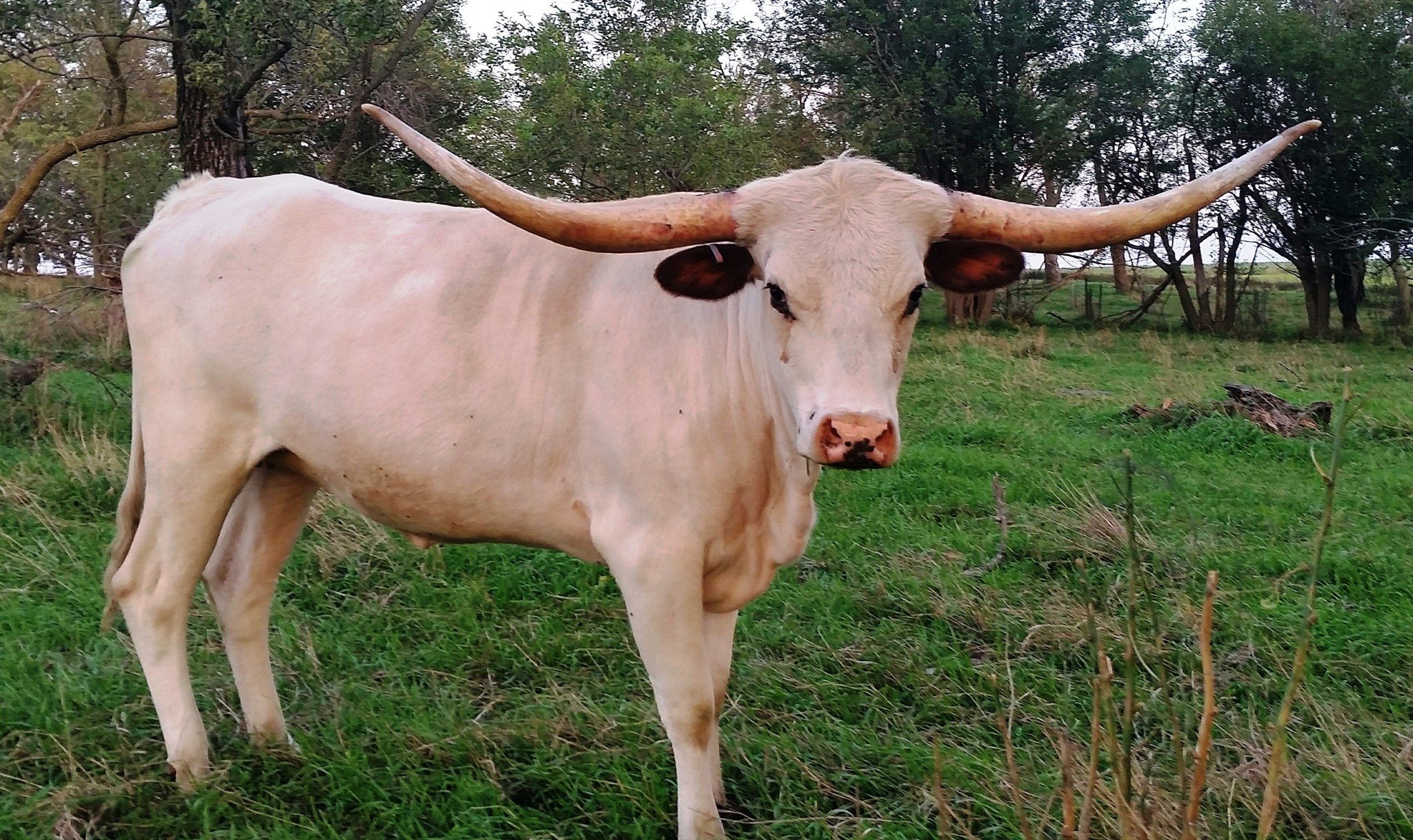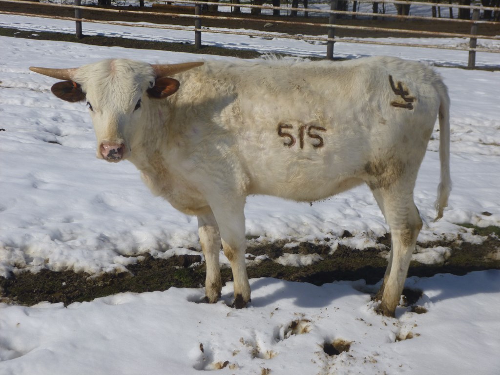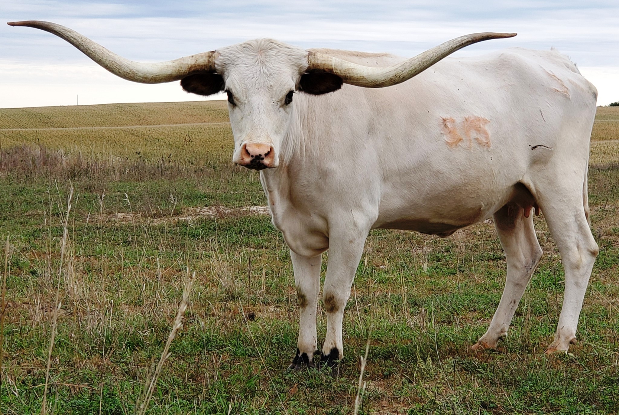 This gal has tons of lateral horn with a great twist. She is 84.5'' TTT and by the wow cow, Carmen BCB 123 who has over 118" of total horn. Maybellene is tall, feminine and very gentle. She has a gorgeous 2024 heifer by Drag Iron at side.